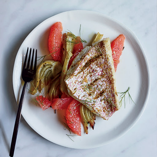 F&W's Justin Chapple rubs a supertasty mix of crushed fennel seeds and grapefruit zest onto snapper before baking it on a bed of sweet roasted fennel.