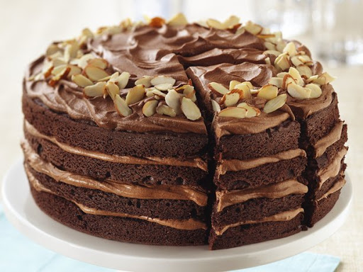 5 Cut each cake layer horizontally into 2 layers. (To cut, mark side of cake with toothpicks and cut with long, thin knife.) On serving plate, place 1 bottom cake layer, cut side up, frost top with about one-fourth of the mousse. Repeat with second and third layers. Top with remaining cake layer and mousse. Sprinkle sliced almonds around top edge of cake. Refrigerate at least 30 minutes or until firm enough to easily cut before serving. Store covered in refrigerator.