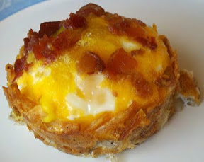 Shredded hash browns pressed into muffin tin; salt and pepper to taste, add shredded cheese, bake in oiled muffin tin for 15 mins at 425. Reduce heat to 350 add egg and bacon pieces and some cheese on top bake 15 to 18 additional mins.