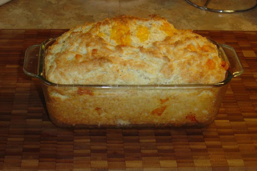Heat oven to 350 degrees. Grease a 9×5 loaf pan with oil. In a bowl, whisk together the first 5 ingredients. Carefully stir in cheese cubes until covered in flour mixture, this will help prevent your cheese sinking to the bottom of your loaf of bread. In a different bowl, whisk together the remaining ingredients. Fold the wet mixture into the flour and cheese mixture, stir until just combined, do not over stir. Spread the mixture into the loaf pan. Bake for 45-50 minutes. Let cool 10 minutes and then remove from pan. Allow to cool for one hour before slicing and serving.