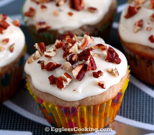 Frost the cupcakes and top it with the balance 3/4th cup of toasted and chopped pecans.