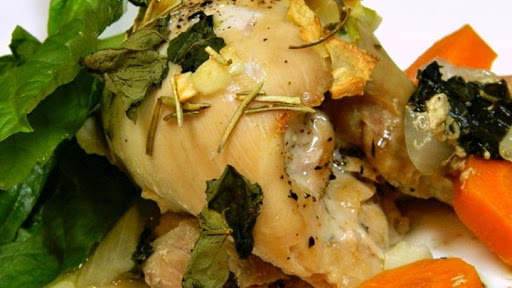 Arrange chicken thighs in a roasting pan; season with salt and pepper. Scatter onion over and around chicken. Top chicken with basil, garlic, and rosemary. Pour chicken broth into pan and evenly distribute carrots around the chicken. Cover pan with aluminum foil.