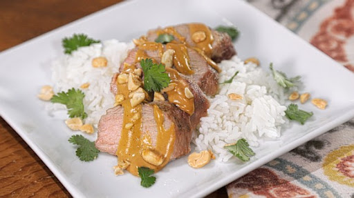 Remove the pork from the oven, let rest 5 minutes. Slice and serve with the peanut sauce, Jasmine rice, cilantro, and chopped peanuts.