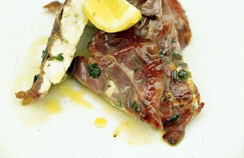 7. Lay 3 prosciutto slices on each chicken breast, overlapping them slightly. (Watch the video of Jamie making this chicken breasts recipe)