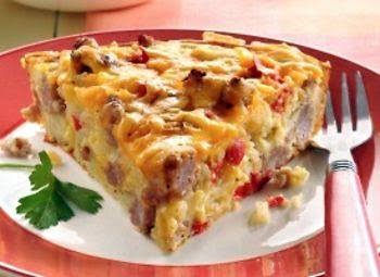 2.In 10-inch skillet, cook sausage, bell pepper and onion over medium heat 8 to 10 minutes, stirring occasionally, until sausage is no longer pink; drain. Mix sausage mixture, potatoes and 1/2 cup of the cheese. Spread in pie plate.