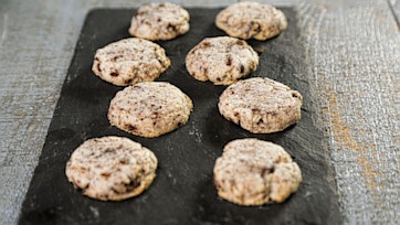 Scoop 2 tablespoons of cookie batter and form into a round disc. Place on prepared baking sheet. Repeat with remaining cookie dough. Bake cookie for 10 minutes, until the edges are golden. Remove and allow cookies to cool for 10-15 minutes. Remove cookies to a cooling rack.