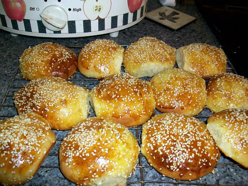 7) Place the buns on a lightly greased or parchment-lined baking sheet, flattening them to about 3" wide. Cover them, and allow them to rise till they're very puffy, about 1 hour. Towards the end of the rising time, preheat the oven to 375°F.