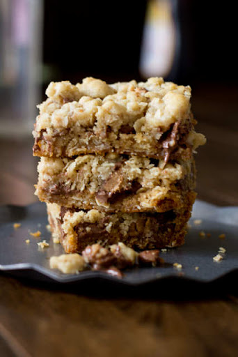 press half of the crumb mixture into the baking dish. bake for 8-10 minutes or until the crumb mixture is beginning to get browned. remove from the oven and sprinkle with the chocolate chips and then the reese's peanut butter cups. sprinkle with the remaining crumb mixture and place back in the oven for another 15-18 minutes.