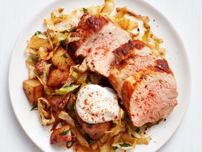 Add the broth and brown sugar. Bring to a boil, then reduce the heat to medium low; cover and cook until the vegetables are tender, 8 to 10 minutes. Stir in the vinegar. Increase the heat to medium high; cook until the sauce is reduced, 4 minutes. Add the herbs. Slice the pork; serve with the vegetables. Top with the sour cream and more paprika.