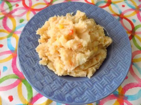 Drain and return to pan. Add sour cream, butter, salt & pepper. Mash with a masher or electric mixer until there are only small pieces of carrots in smooth potatoes.