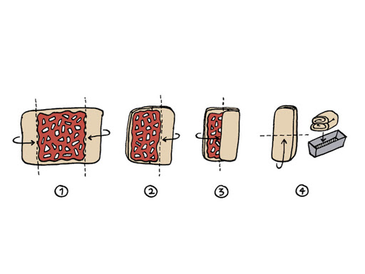 Heat the oven to 450°. Line a 9-by-5-inch loaf pan with parchment paper. Scrape the dough onto a lightly floured work surface. Using a rolling pin, flatten the dough into a 1⁄16-inch-thick, 26-by-18-inch rectangle, and position the rectangle so that a long side is nearest to you. Spread half the tomato sauce over the middle three-fifths of the rectangle, then sprinkle the sauce with half of the caciocavallo slices. Fold the two plain sides of the dough over so their edges overlap in the middle of the rectangle by 2 inches.