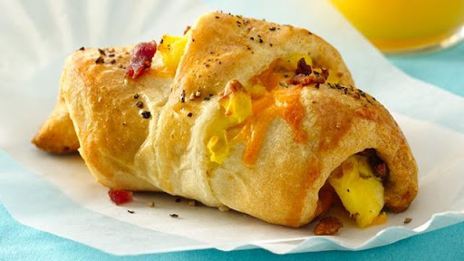 Top each triangle with bacon, scrambled egg and cheese. Roll up loosely as directed on can. Place on ungreased cookie sheet; curve into crescent shape. Brush with beaten egg; sprinkle with pepper.