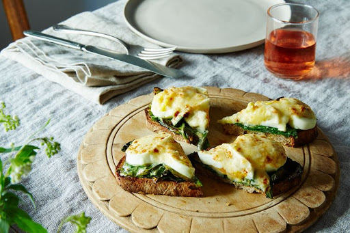 5. Set the oven to broil. Line a baking sheet with aluminum foil, and place the slices of bread on the baking sheet. Assemble the crostini by adding a layer of Swiss chard to each piece of bread. Slice the eggs (from top to bottom, so every piece has a bit of white and yolk), and place the egg slices on top of the Swiss chard in a single layer. Drizzle 1 1/2 tablespoons of the caramelized onion sauce over the top of each crostini (you will have extra sauce left over—store it in your refrigerator and use it with pasta for a nice snack on another day). Top each piece of bread with a handful of grated Gruyère. Broil the crostini until the cheese begins to bubble and turn brown. Keep a close eye on the crostini, as they will cook quickly. When they look beautiful, remove them from the oven, serve, and enjoy.