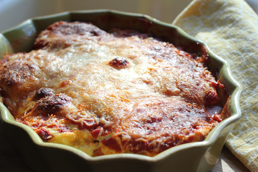 Cover eggplant with spaghetti sauce then top with Parmesan cheese