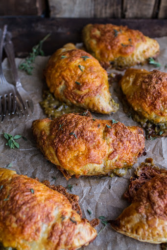 Repeat with the rest of the pastry dough. When all of the pies are on the baking sheet, cut air holes in the top of each pie and then brush the tops with egg wash. Sprinkle with a little cheddar cheese. Bake for about 20 to 25 minutes until puffed and nicely browned. Don' freak, but these are going to ooze! Serve warm with the remaining soup for dipping!