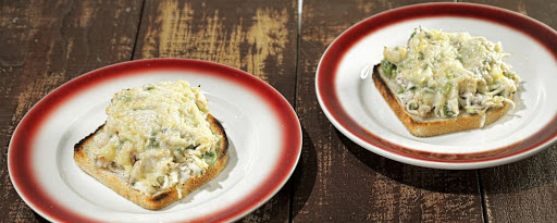 Place bread onto a baking sheet, divide the white fish salad onto the 6 pieces of bread, top with cheese and place under broiler until the cheese is melted and bubbly.