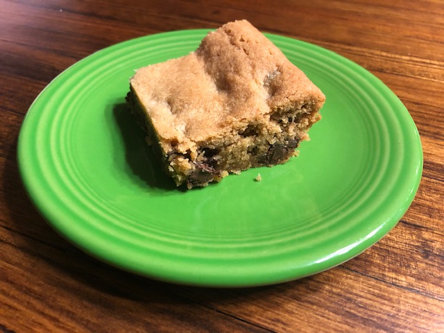 Preheat oven to 350. Grease a 9 x 13 baking dish with nonstick cooking spray. In a large bowl, combine butter, brown sugar, & sugar with a mixer until light & fluffy, about 2 minutes. Add the peanut butter, vanilla, & eggs. Beat until fully combined. In a small bowl, whisk together the flour, baking soda, & salt. Turn mixer to low & slowly add the flour mixture to the butter mixture. Fold in the chocolate chips. Spread mixture into the baking dish. Bake 30-35 minutes until set. Do not over bake. Allow to cool completely before cutting into squares.