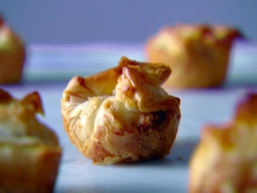 Place 1 sheet of phyllo on a dry work surface. Place one slice of cheese about 5 inches from the top of the narrow end of the sheet. Fold the top of the narrow end over the cheese, leaving 1 inch between the fold and the cheese. Next fold over 1 of the long sides then the other, again leaving 1-inch between the folds and the cheese. Then fold the cheese over, again leaving 1-inch between the fold and the cheese. Continue folding to make a package about 3 1/2 by 4-inches. Continue with the remaining pieces of cheese and phyllo.