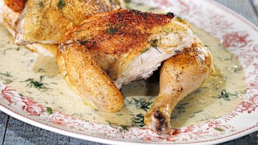 To serve, cut the chicken into 4 pieces. Spoon the sauce onto the plates or platter and place the chicken pieces on top. Garnish with additional dill and serve.