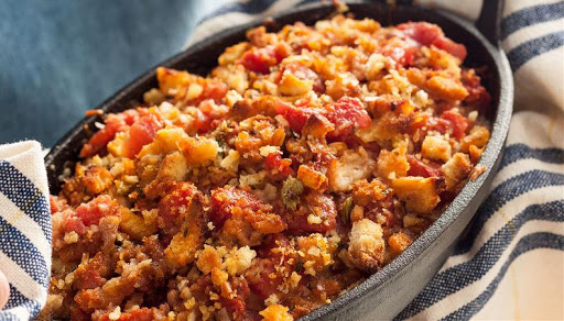 Preheat oven to 400o F. Place diced tomatoes in a medium bowl and add garlic, stuffing mix, water, oil and vinegar; stir just until stuffing mixture is moistened.