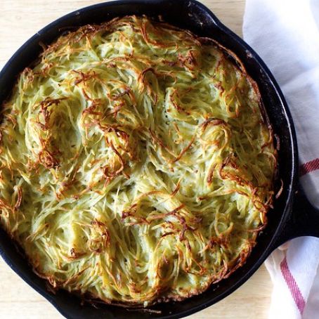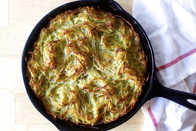 Heat a 1/4 cup oil or fat in a 10-inch cast-iron skillet** over high heat until very hot. Pour potato-egg mixture into pan carefully (it’s going to splatter) and spread evenly in pan. I like to twist and tousle the top strands a little for a pretty final texture on top. Drizzle with last tablespoon of oil. Bake in heated oven for 75 to 80 minutes, until browned on top and tender in the middle. If top browns too quickly, before center is baked, cover with foil for all but the last two minutes of baking time, though this has never been necessary in my oven.