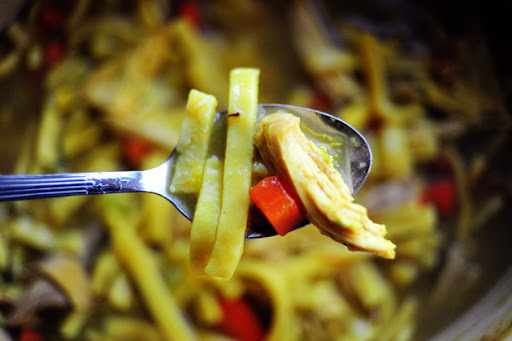 Increase heat and add frozen egg noodles and chicken. Cook for 8 to 10 minutes.