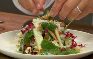 Making the vinaigrette: In a bowl, whisk together the vinegar and honey. Season to taste with salt and pepper. Whisking continuously, slowly pour in the olive and walnut oils. Taste and, if necessary to balance the acidity, stir in a little more honey.