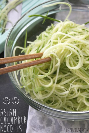 Using a mandoline or any other julienne tool, julienne both cucumbers and place the "noodles" in a bowl