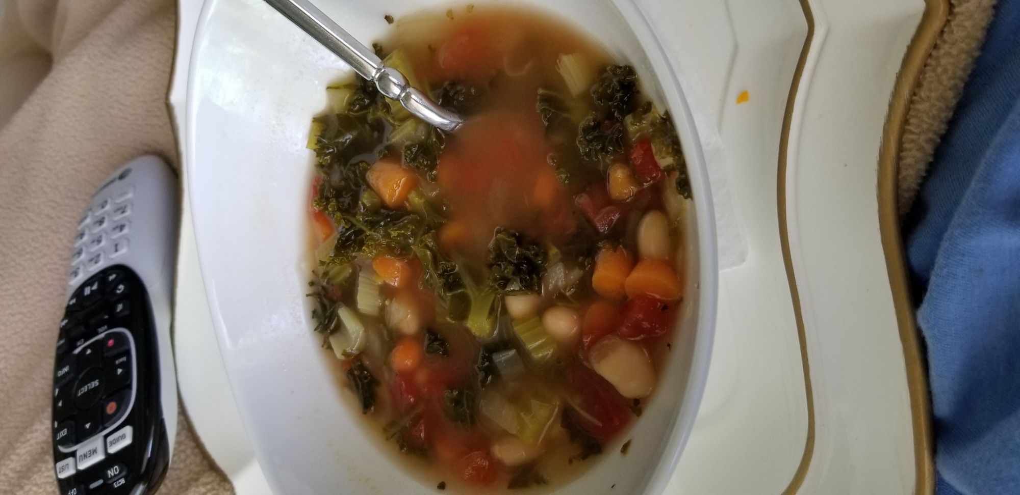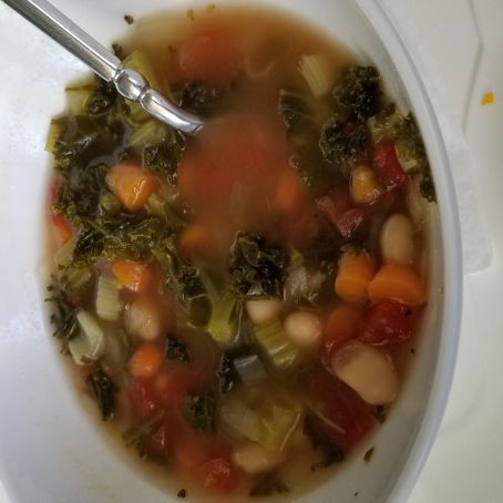 In a large saucepan cook carrots, celery and onion in oil over med-high heat for 3-4 minutes, stirring occasionally. Add broth, kale, beans and untrained tomatoes. Bring to a boil; reduce heat, cover and simmer for 20 min, stirring twice. Season to taste with salt & pepper. To serve top with croutons and grated Parmesan if desired. Makes 8 servings.