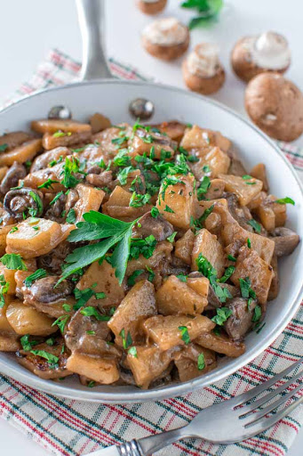 Add potatoes to the mushrooms and keep frying, stirring occasionally for 10 minutes.