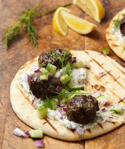 To finish, lightly grill the pitas or naan in the grill pan for about a minute to toast and warm through. Top with kofta and some tzatziki.