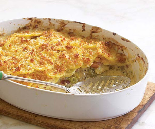 Place baking dish on prepard baking sheet. Cover dish tightly with foil, bake 1 hr 15 min, or until potatoes are very tender and top is golden brown. Let stand for 15 min, before serving.