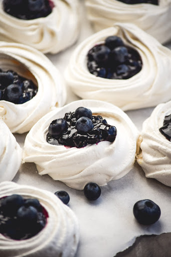 Secondary filling: Make compote filling (blueberry, peach, etc.) and fill "nests" with spoon. Makes about 10 - 2 1/2-inch meringues (I actually made mine a little smaller and got about 18).