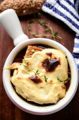 Ladle the soup into little oven-safe crocks, top with 1-2 pieces of toasted baguette, place a large dollop of the vegan mozzarella on top (reheat the cheese if it has become too thick to easily dollop on top and spread), and place the crocks on a baking sheet.