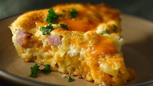 In large bowl, mix 2 cups of the cheese, the ham and uncooked macaroni. Spread in pie plate.