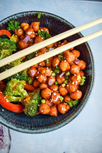 Stir in the General Tso's sauce. Drain the chickpeas and stir them in too. Cook for 1-2 more minutes, continuing to stir frequently, or until the mixture is hot throughout and the sauce has coated the chickpeas and vegetables. Add more soy sauce or chili sauce to taste.