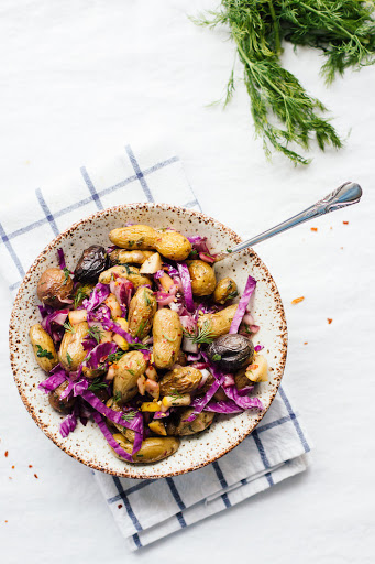 Roast the potatoes with a drizzle of olive oil, sea salt, and pepper and bake for 30 minutes or until fork tender, at 350 degrees F.
