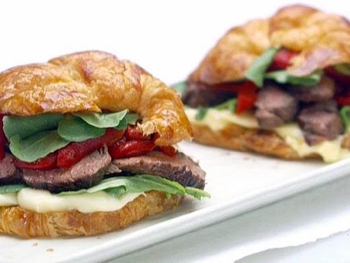 Heat a large nonstick skillet or griddle over medium heat. Using a serrated knife, slice the croissants in half lengthwise. In 2 batches, place the croissant halves, cut side down in the skillet and cook for 30 seconds to 1 minute until lightly toasted. Lay the Brie slices over the toasted croissant halves. Place about 1/4 cup of the arugula on the bottom halves of the croissants. Add the sliced steak. Arrange the red bell pepper on top of the steak. Top with the remaining arugula and add the top of the croissant. Serve immediately.