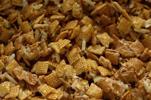 Combine Rice Chex and Golden Grahams, coconut and almonds in a large mixing bowl. Stir to combine.