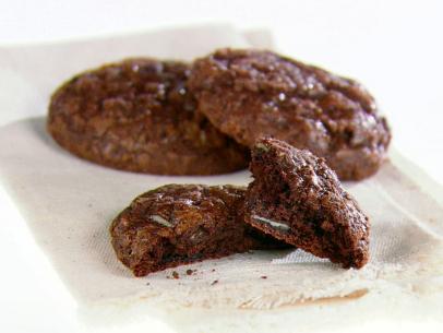 3. Whisk together the flour, cocoa, baking powder and salt in a medium bowl. Whisk the sugar, eggs, 2 tablespoons water and vanilla to blend in a separate large bowl. Stir in the dry ingredients and fold in the cooled chocolate using a rubber spatula. Fold in chocolate mint pieces. Chill dough to firm slightly, 10 minutes.