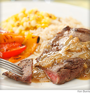 Cooking whiskey removes the boozy taste, but leaves the sweet oaky flavor behind, which lends itself beautifully to tender grilled skirt steak, as we do here, or to grilled pork or chicken. Serve with baked beans and corn on the cob.