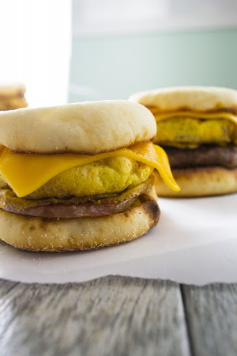 To Reheat: Unwrap the frozen sandwich and microwave on a paper towel for 1-2 minutes. You can also do what I do and remove the English muffin and pop it in the toaster.