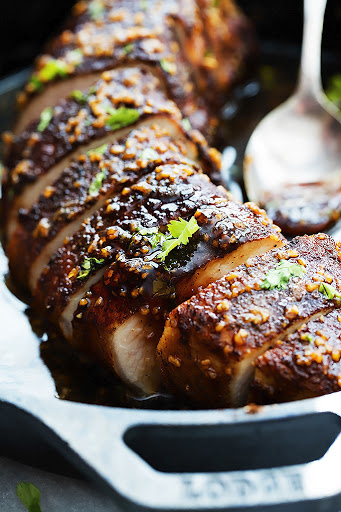 5.Cut tenderloin into 1-inch thick slices. Use a spoon to drizzle the glaze from the pan all over the tenderloin just before serving.