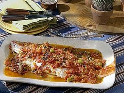 Preheat oven to 425 degrees. Spread 3 tablespoons sauce in bottom of glass baking dish. Arrange fish atop sauce. Sprinkle fish with salt and pepper. Spoon remaining sauce over. Bake uncovered until fish is just opaque in center, about 18 minutes. Serve with rice or pasta dish.