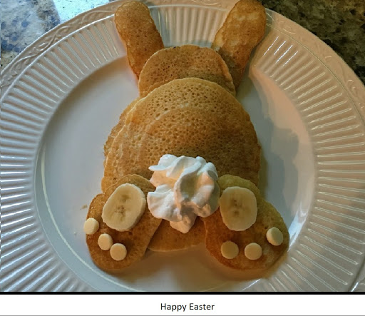 Whip up some pancakes and make 1 large, 1 small, 2 tall (ears) and 2 oblong (feet).