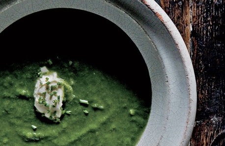 Ladle soup into bowls and top each with a spoonful of crème fraîche and some chives. Serve immediately.