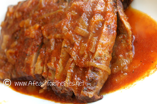 Brisket is a cut of beef that can be very tough, unless it is slow-braised or very slow grilled. The patience pays off, because the meat becomes very tender and moist. I saw this recipe on Cook's Country, and was intrigued that the recipe name comes from using Coca Cola (from where the soft drink originates). Instead of marinating the beef in Coca Cola (Cook's Country say it gave the beef a mush texture) and using packaged onion soup mix, this recipe uses ketchup, spices and herbs to make this a "scratch" brisket. The meat turned out really tender, and the sauce was absolutely delicious! It had the perfect balance of tomato, with just the right amount of acidity. Serve this with mashed potatoes, and you have a Sunday supper that your family will rave about.