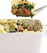 5. Arrange the spinach over the meat mixture, then spoon the potatoes on top. Drizzle with the remaining 1/2 tablespoon olive oil. Bake until golden, about 25 minutes.