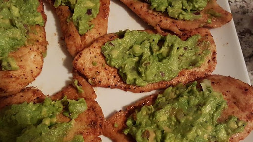 Stir the onion, lime juice, and avocado together in a bowl; season with salt and pepper. Spoon over the chicken breasts to serve.