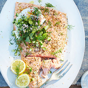 Roast for 25 to 30 minutes or until fish flakes easily when tested with a fork in the center. Finely shred 1 teaspoon peel from lemon; set aside. Halve lemon and squeeze over salmon. Dollop with yogurt and top with cucumber, shallots, herbs, lemon peel, and crushed red pepper. Season with additional salt and drizzle with additional olive oil.